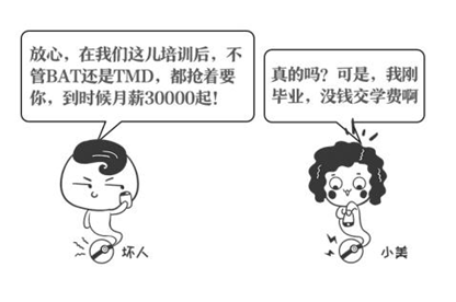求职者所面对的招生骗局与学生求学所面临的招生骗局不同,很多培训机构以招聘为名,以高薪、名企工作岗位为饵,诱导求职者交钱参加培训,而求职者接受培训以后,对方却根本不会提供长期稳定的可靠工作。