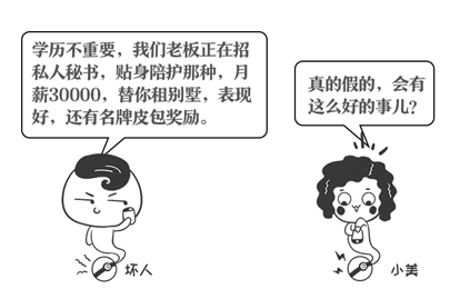 色情类招聘陷阱的目标多为年轻女性,也是唯一一种不以直接骗取财物为目标的非法招聘,多是利用求职者拜金心理、投机心理,以及急需用钱的特殊情况,引导求职者牺牲身体,换取财富,并从中收取提成。